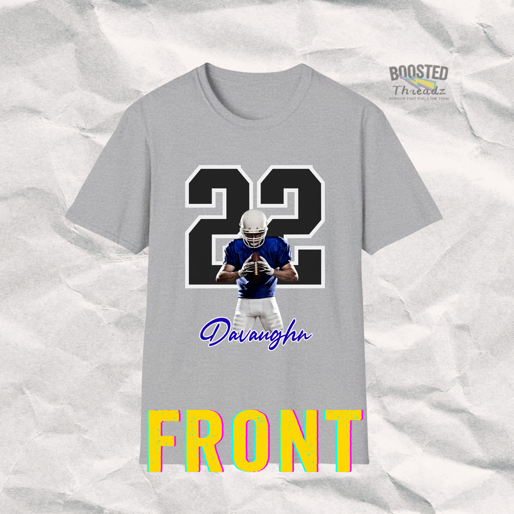 Show your spirit with our Custom Player Photo Tee – Personalized with Name, Number & Action Shot - Front & Back.